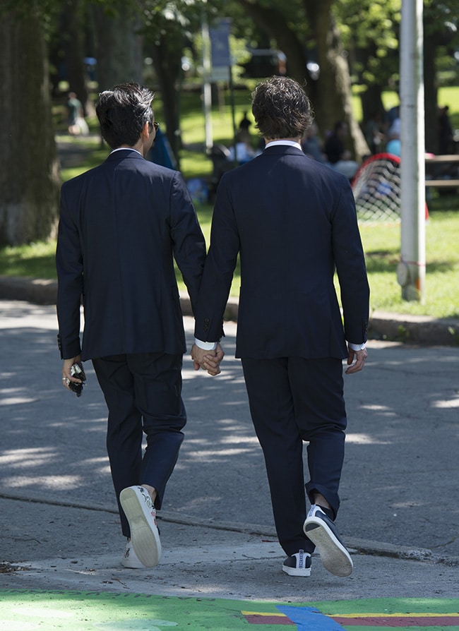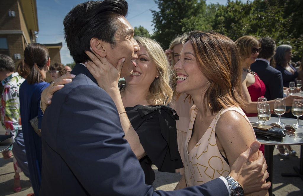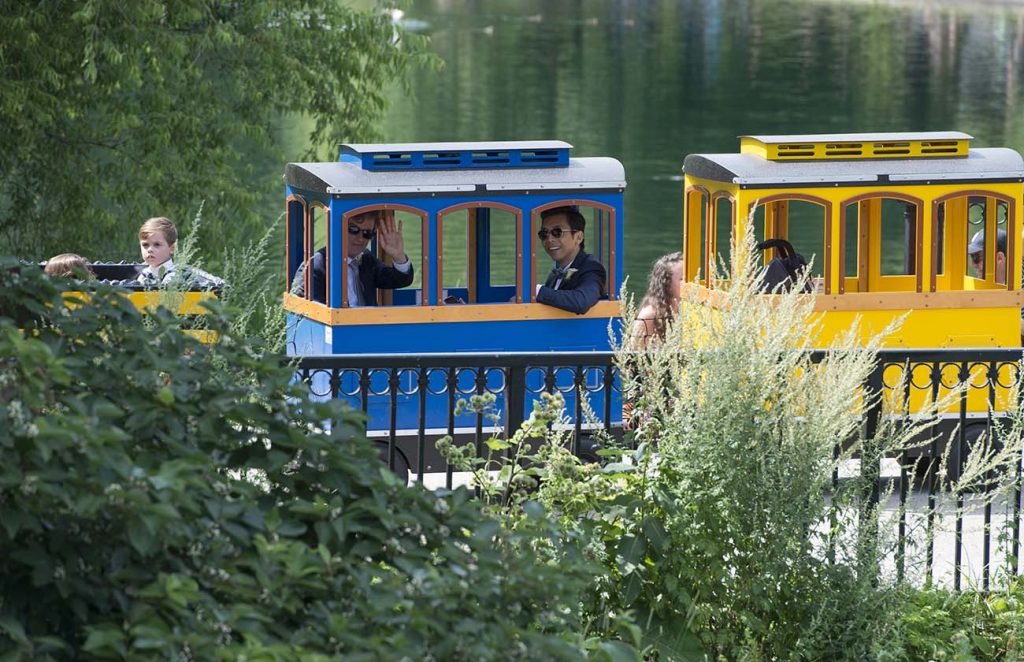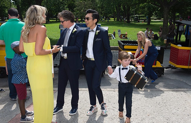 Le soleil brillait de tous ses feux pour la cérémonie, qui a débuté au parc Lafontaine, joyau de verdure du Plateau Mont-Royal. Les promis ont avancé dans les allées fleuries à bord du célèbre petit train local, entourés de la bouquetière et du petit page. Les invités retenaient leur souffle, attendant le couple au bord du bassin d’eau. Le site regorgeait de fleurs blanches et d’énormes ballons transparents remplis de confettis.