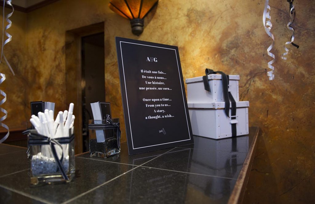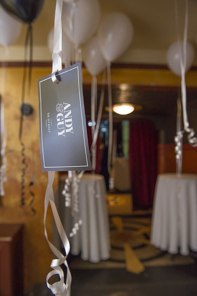 Dans le hall, des ballons noirs et blancs suspendus les accueillaient les invités, et au bout d’un ruban, ils ont pu écrire leurs vœux de bonheur aux nouveaux mariés.