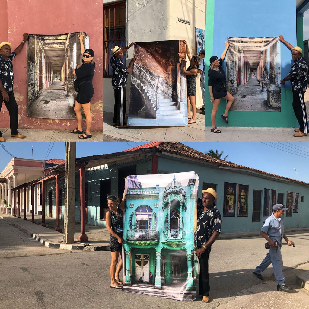 Ensemble, nous avons installé son expo sur les murs de la ville. J’ai eu l’honneur de choisir l’emplacement de chaque affiche au format géant selon les couleurs des murs des maisons cubaines. Tout un honneur!