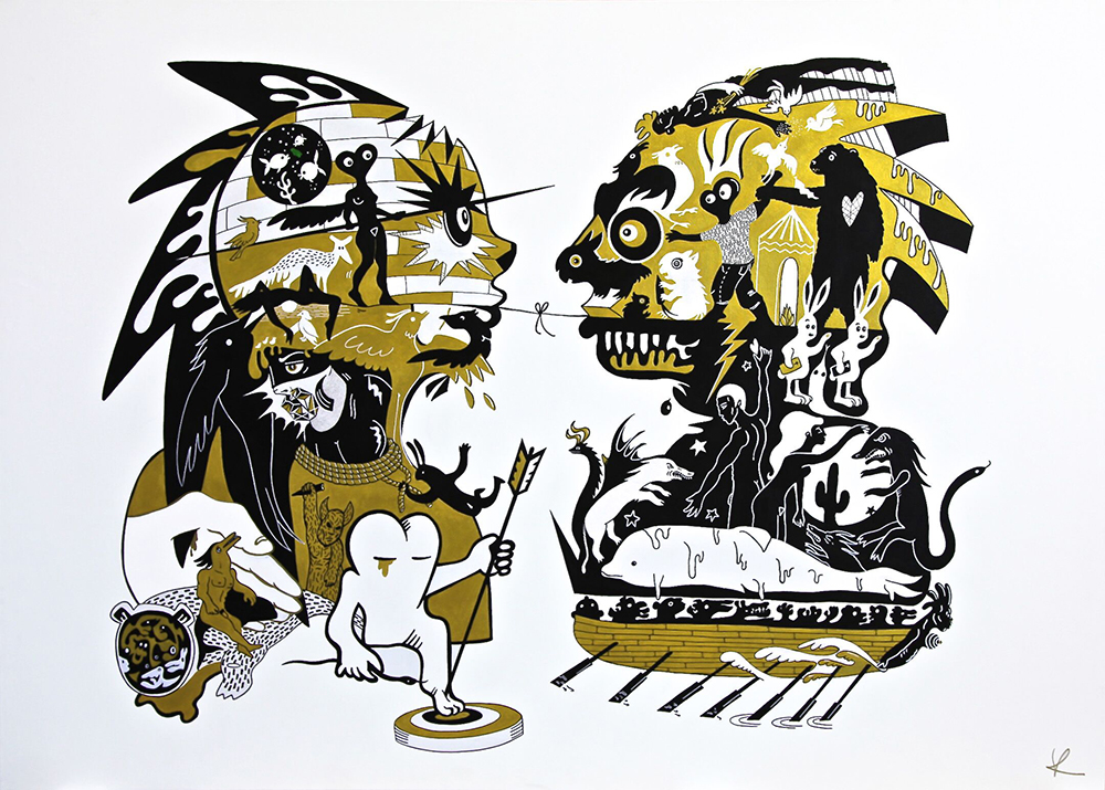 Parce que je traite beaucoup du subconscient. J’avais envie de mettre sur toile des images qui me trottent dans le subconscient… tous les questionnements que je peux avoir! Et on le sait bien, les questionnements, ils sont à l’origine de l’homme. Et c’est de là que c’est parti. Le dessin, c’est à l’origine de Stéphane aussi, parce que j’ai toujours dessiné! Depuis le plus longtemps que je me souvienne et bien avant de faire des blagues. Ça fait vraiment longtemps!