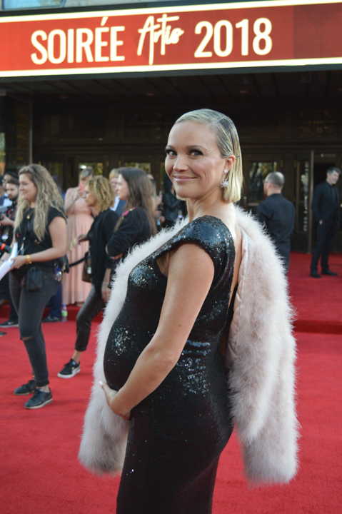 3. Julie Ringuette a choisi un look rétro avec cette longue robe noire à paillettes de La petite robe noire. Nous adorons l’étole de fourrure.