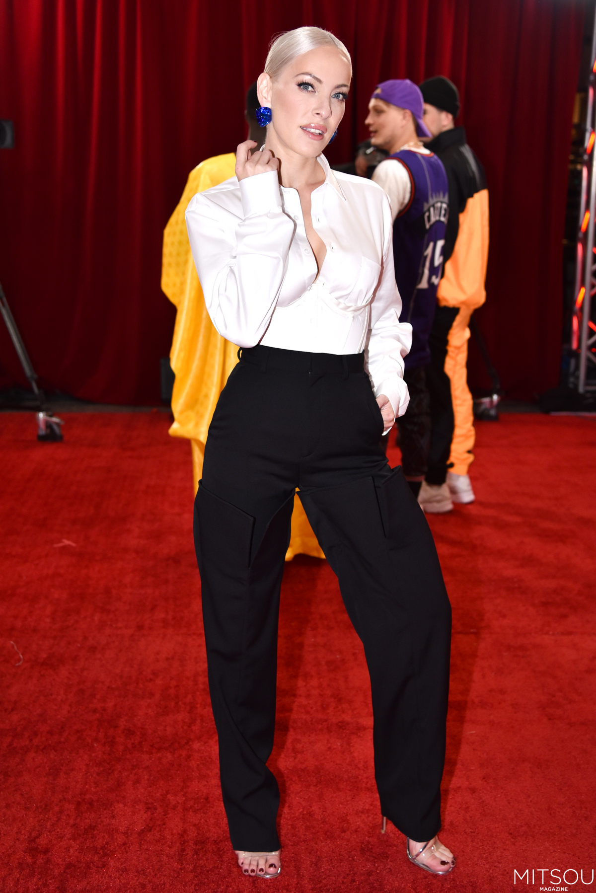 L’auteure-compositrice-interprète a délaissé la robe pour un corset blanc de Kiki de Montparnasse et des pantalons noirs très classes de Y/Project.