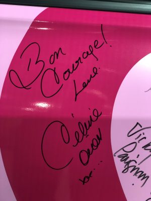 Si vous voulez faire comme Céline et signer la voiture de Valérie pour montrer votre appui à la cause, le bolide sera bien en vue lors de l’événement de célébration de la Virée rose qui aura lieu le 29 septembre de 11 h 30 à 15 h au Parc Maisonneuve à Montréal. Attention! Valérie m’a dit à la blague qu’elle demandait plus cher pour signer près de Céline! La grande célébration de la Virée rose est un événement gratuit et ouvert à tous. Au programme, une prestation de danse à claquettes, un échauffement avec Happy Fitness et un spectacle de clôture avec Lulu Hughes, Mitsou, Guy A. Lepage, Marina Orsini, IMA, Jonas, Luce Dufault, Les Porn Flakes, Rick Hugues et Élizabeth Blouin-Brathwaite.