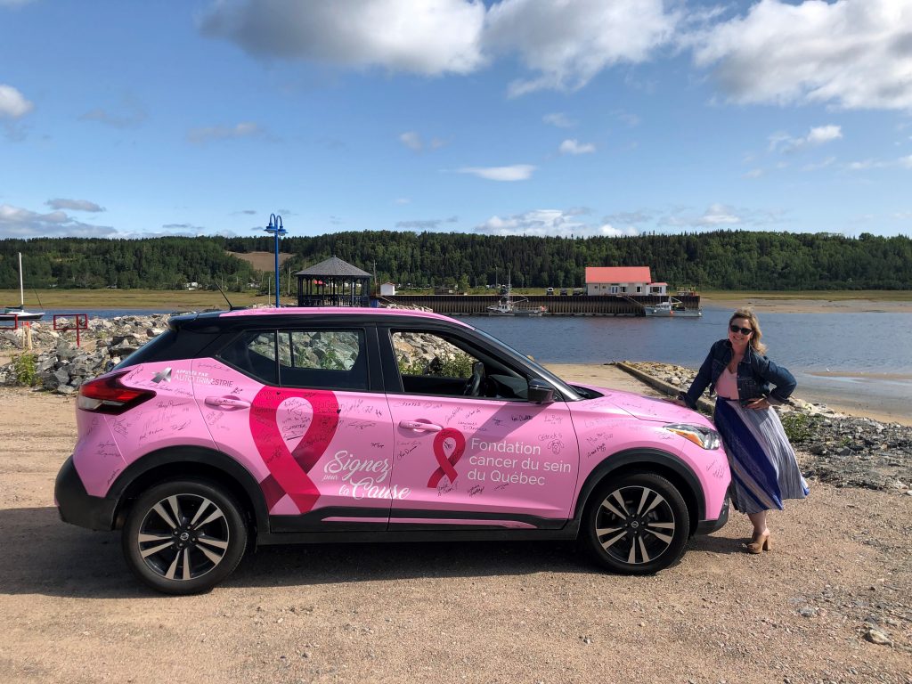 Au début de l’été, Valérie s’est associée à Nissan de Sherbrooke qui a accepté de faire recouvrir un KICKS aux couleurs de la Fondation cancer du sein du Québec. Pendant la belle saison, la présentatrice s’est promenée dans la voiture et a offert aux gens de la signer en échange d’un don. Certains lui ont donné quelques dollars et elle a même reçu un don de 400$! Grande fan de Céline, elle avait une idée en tête : faire signer la fameuse voiture par son idole lors de son passage dans la belle province en septembre.