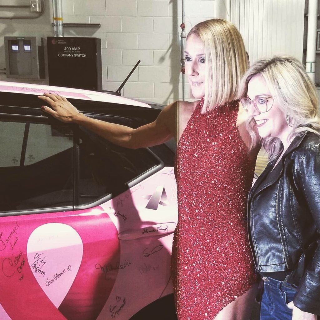 Le passage de Céline Dion au centre Vidéotron de Québec a fait bien des heureux parmi ses fans, mais il y en a une, en particulier qui jubilait de voir se réaliser l’un de ses grands projets : faire signer sa voiture aux couleurs de la Fondation cancer du sein du Québec. Il s’agit de Valérie Sirois, l’un des visages-vedettes de la Virée Rose et présentatrice météo à Radio-Canada Estrie.