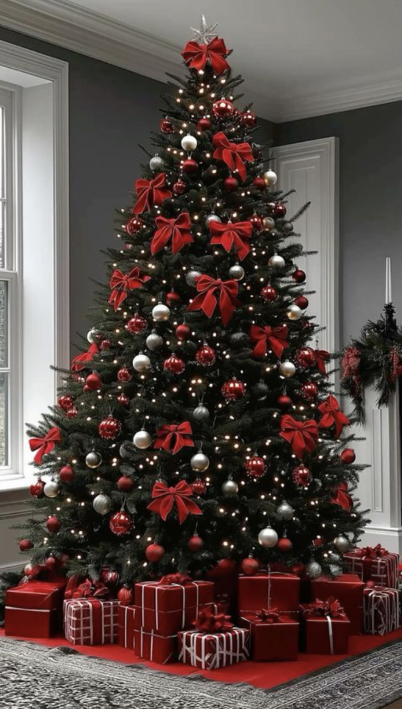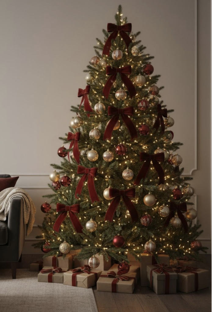 Pour réaliser ce décor: misez sur un sapin bien fourni (naturel ou artificiel) avec un léger effet givré pour apporter ce charme hivernal rétro. Commencez par installer de larges rubans en velours bourgogne ou crème, que vous façonnerez en boucles généreuses pour remplacer certaines boules traditionnelles. Ajoutez ensuite des ornements rouges, des touches dorées et quelques éléments en bois pour renforcer le côté rustique. Terminez avec des décorations scintillantes, placées près des lumières pour créer un éclat des Fêtes.