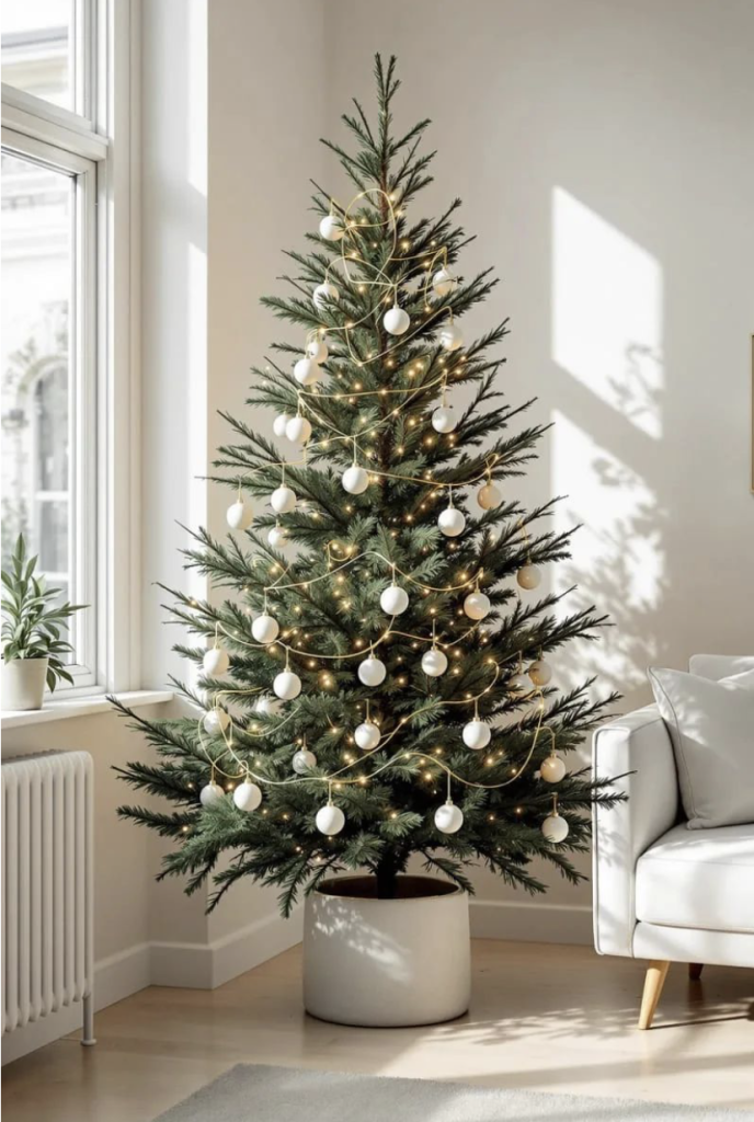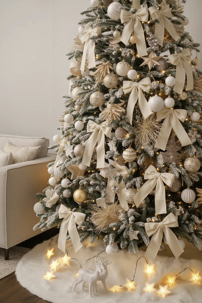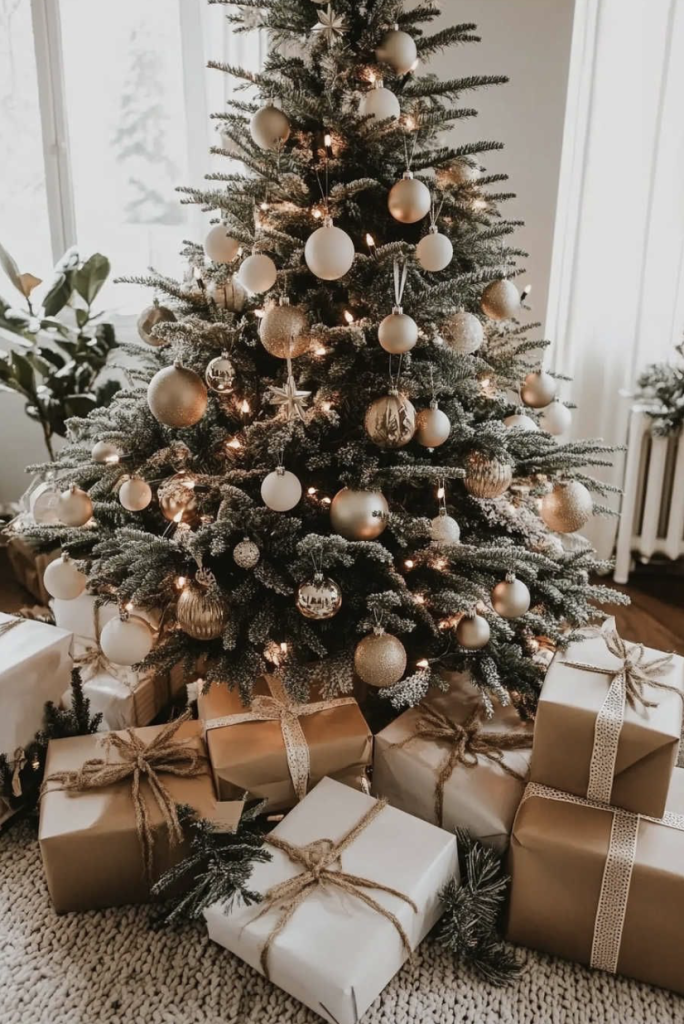 Pour réaliser ce décor: choisissez des rubans en lin crème, petites branches d’eucalyptus, boules transparentes, ornements dorés minimalistes. Parfait pour une atmosphère sereine façon magazine.