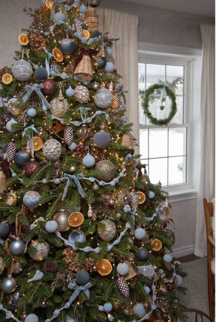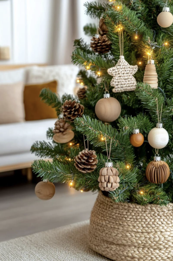 Le besoin d’authenticité se traduit en une tendance calme, texturée et très Pinterest: bois clair, lin, chanvre, eucalyptus, pommes de pin naturelles et une touche luxueuse pour équilibrer le tout. On obtient un sapin à la fois naturel et élégant.