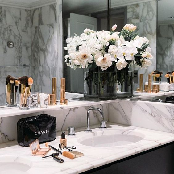 C’est insensé! Tout dans la maison a été rénové, sauf la chambre des maîtres et notre salle de bain. Aujourd’hui, les robinets sont déglingués, le calfeutrage de la douche a disparu et la même belle peinture originale de l’année de la construction, beige 2001 est toujours… beige 2001. C’est d’ailleurs pour cette raison que je fais toutes mes vidéos de maquillage dans ma cuisine!
