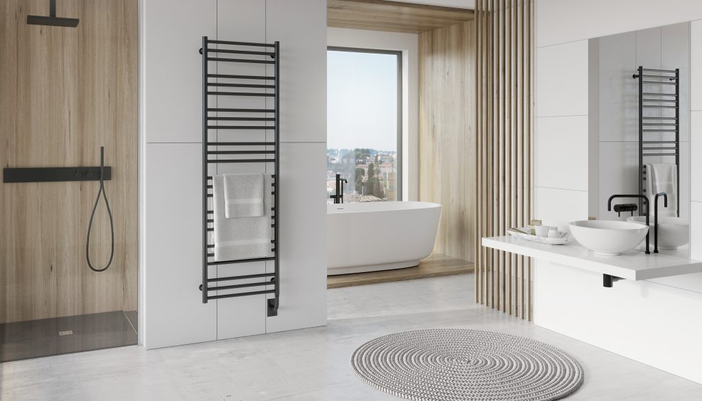 À la maison, l’un des petits luxes que nous avons est un plancher chauffant dans la salle de bain. C’est un détail très apprécié de nos pieds quand on sort de la douche les soirs d’hiver ou pendant une visite nocturne à la salle de bain. Alors, imaginez un porte-serviette qui réchauffe votre serviette pendant que vous êtes sous la douche afin qu’elle soit bien chaude et douillette quand vous la draperez autour de vous. On aime!