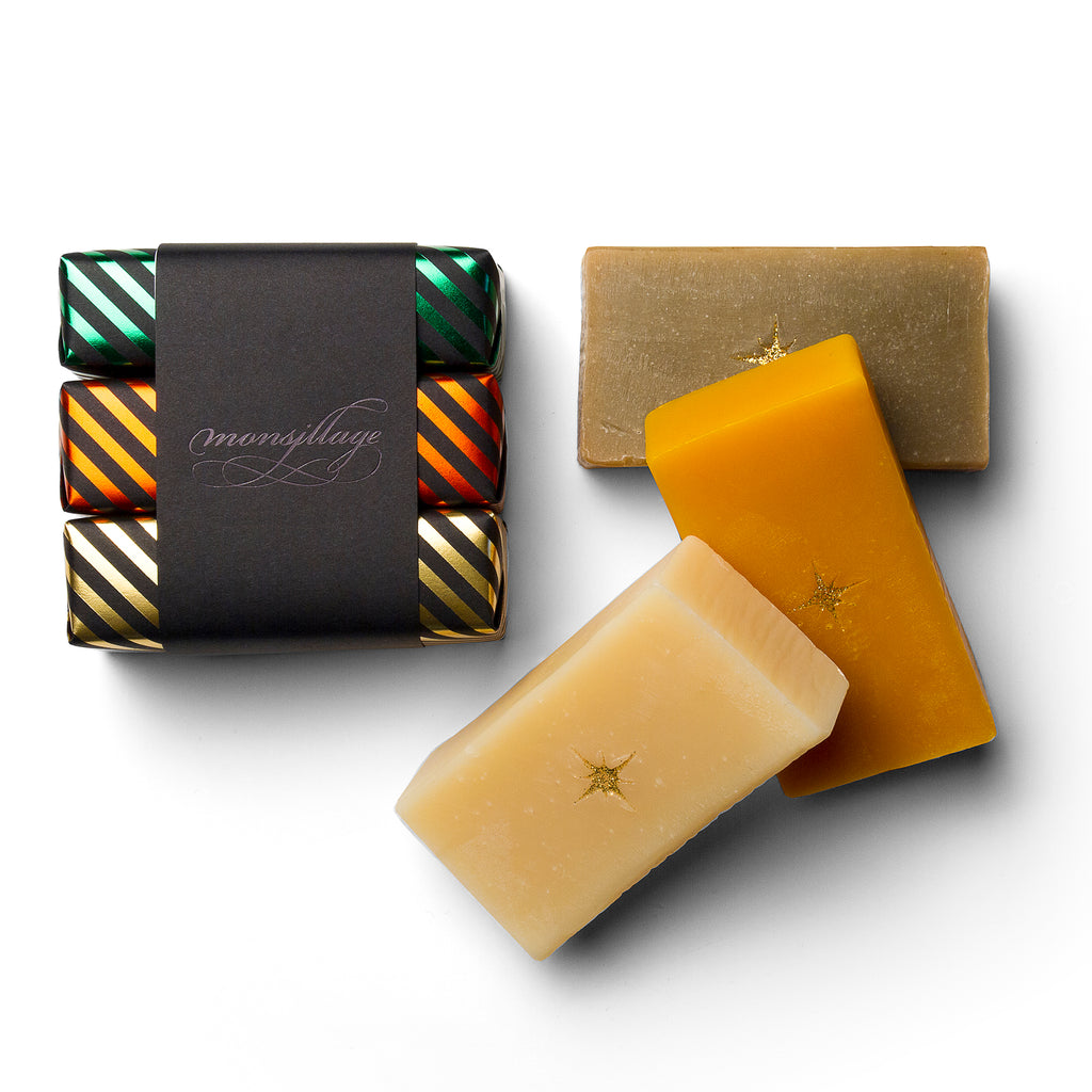 Les savons de Noël de la fabuleuse parfumerie québécoise monsillage, entièrement faits à la main, fleurent bon les Fêtes: Sapin et cassis, Myrrhe et encens, Orange et épices. Prix: 40 $ pour 3.