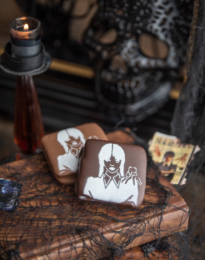 • Manger une tablette de chocolat en forme de Frankenstein ou de momie, une sucette en forme de fantôme ou de citrouille ou encore des guimauves trempées dans le chocolat à l’effigie de Wednesday. La collection Halloween de Choco Chocolat vous fera saliver! Le crâne de Monsieur Jack contient des araignées en chocolat et perles double caramel!