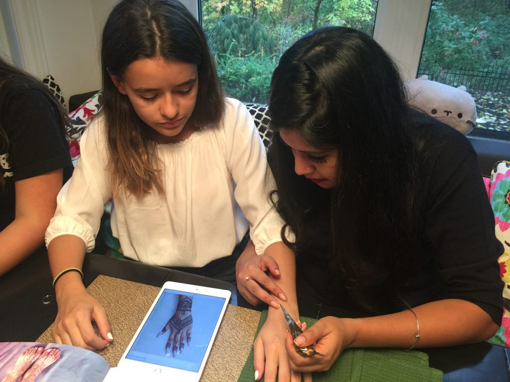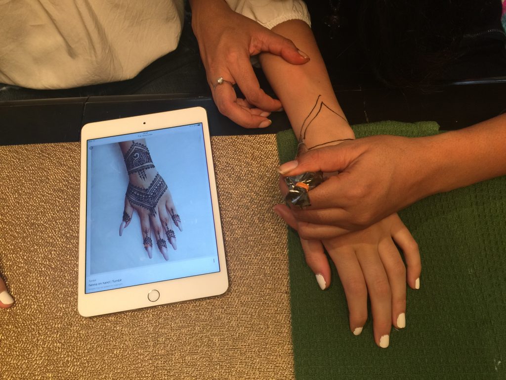 J’ai trouvé mon artiste de henné, Norine Alam de Roshni expression, sur Facebook. Il s’agit d’une médecin qui fait du henné depuis son adolescence pour le plaisir. Après avoir fait des designs sur les mains des filles, elle leur a aussi donné un atelier.