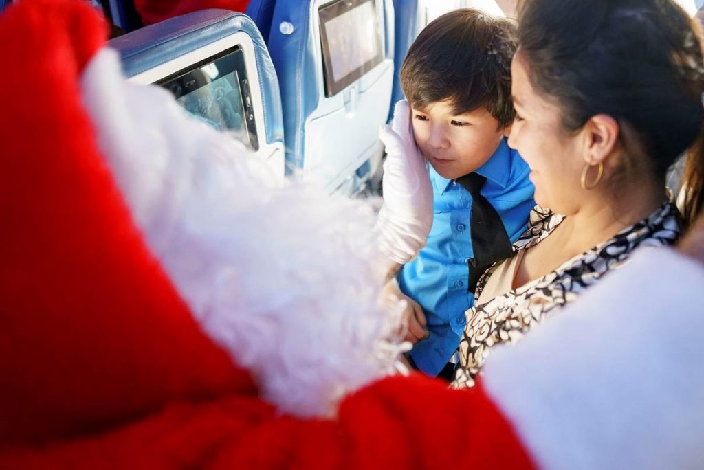 Je me demande comment le père Noël va entrer dans l’avion. Déjà, dans la navette nous menant du stationnement à l’aéroport, je questionne les enfants: