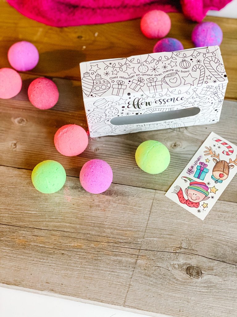 Des bombes de bain qui colorent l’eau, des tatouages temporaires, le tout dans une boîte imprimée en noir et blanc sur un carton recyclé, prête à se faire colorier sur toutes ses faces, que demander de plus! Une fois les bombes terminées, on la réutilise comme boîte aux trésors! Efferv’essence offre cette boîte surprise, ainsi que divers autres produits aussi inusités les uns que les autres.