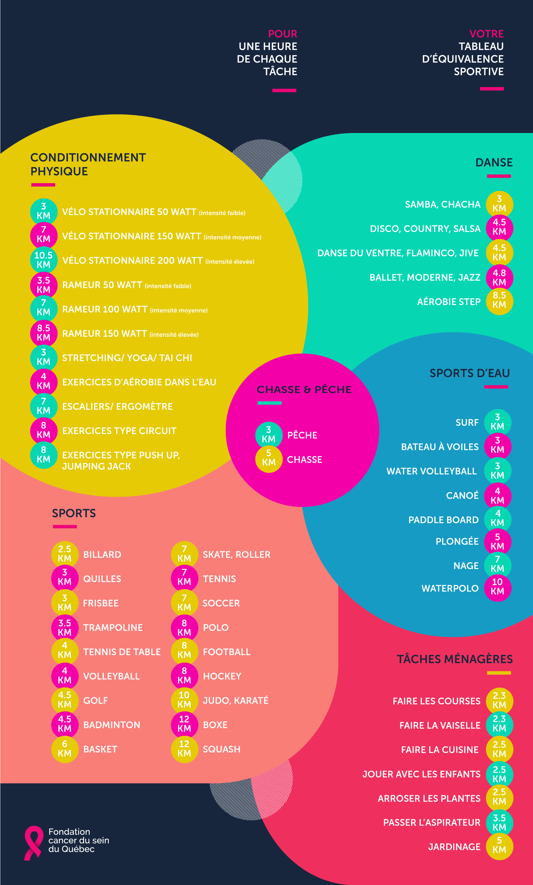 Je termine avec quelques données intéressantes qui vous seront utiles pendant le défi. En se basant sur les données de l’équivalence métabolique d’un effort physique, Myriam Filion, kinésiologue spécialisée en oncologie pour le programme « Ma Santé Active » de la FCSQ, vous a préparé ces infos!
