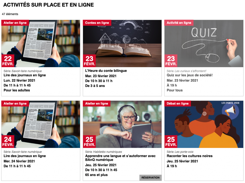 Bibliothèque et Archives nationales du Québec propose aux jeunes une programmation numérique spéciale. Parmi celles-ci: l’Heure du conte en langue des signes (le 27 février), l’Heure du conte en pyjama (le 3 mars), la présentation en ligne du film Le coq de St-Victor (le 3 mars) et Une histoire dont tu es le héros, une activité inspirée du jeu Donjons et dragons qui devrait plaire aux plus aventuriers (le 2 mars). Toutes les activités sont gratuites et la programmation se retrouve ici .