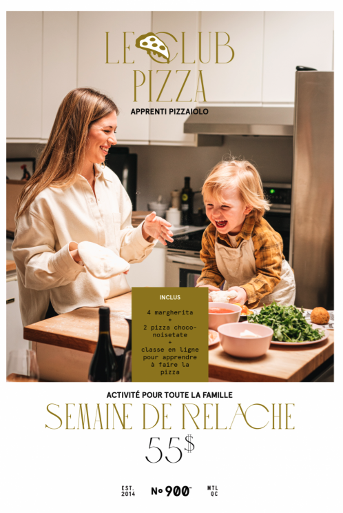 Pizzeria N°900 offre aux petits et grands des kits pour réaliser des pizzas et un cours en ligne avec le chef réputé Mirko. Rien de plus simple: on se procure un kit, qui comprend la classe en ligne et le souper pour toute la famille : 4 pizzas margherita + 2 pizzas choco-noisette ou encore 1 margherita + 5 choco-noisette. C’est à vous de décider! Ensuite, on s’enregistre en ligne à une des 2 classes (le mercredi 3 mars à 16h ou le jeudi 4 mars à 16h), on cuisine et on déguste! Le kit est disponible en ligne, mais il doit être récupéré à la succursale de votre choix. Le kit et le cours sont offerts à 55.00$ et tous les détails sont ici.
