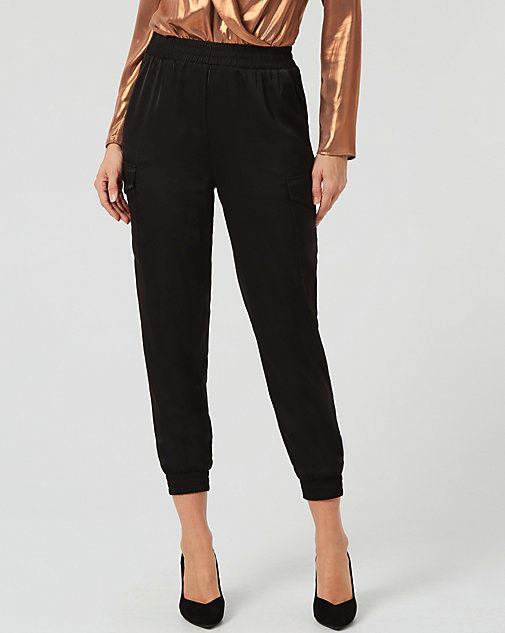 Avec son satin lustré, ses poches latérales pratiques et ses revers élastiques, ce pantalon cargo propose un look cool, confortable et surtout facile à porter. La veste sans manches plus longue, le t-shirt porté à l’intérieur et la paire d’escarpins allongés équilibrent la silhouette.