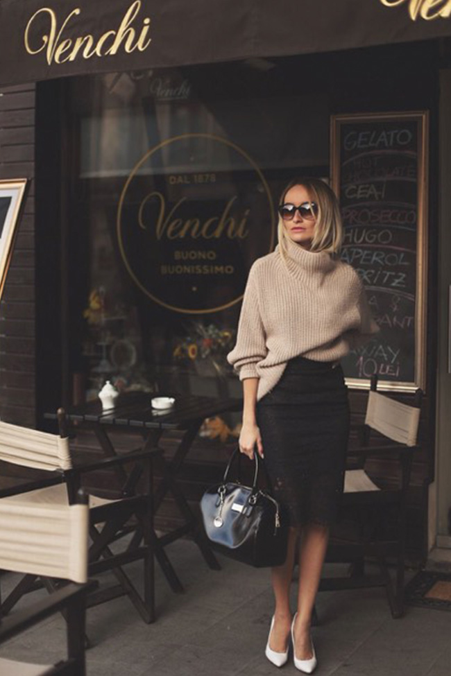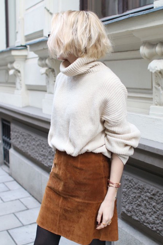 Le col roulé peut sans hésitation se porter avec des jupes. Que ce soit sur une mini-jupe en cuir ou à paillettes, une jupe plissée de longueur midi ou une jupe étroite, le plus important est de jouer avec les textures et les couleurs. Rentrez, de préférence, le col roulé dans la jupe. C’est plus habillé et ça vous donnera encore plus de style.