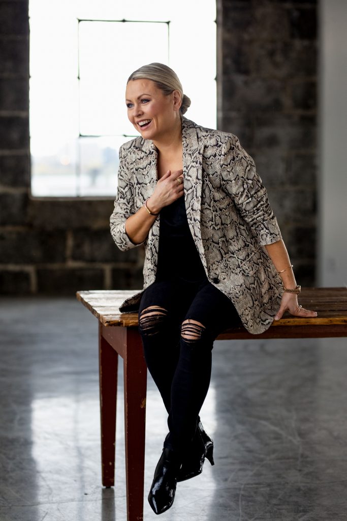 Comme Mitsou adore les vestons, nous avons décidé de lui faire porter l’imprimé dans le haut et d’agencer le reste de sa tenue avec du noir. Le veston est ainsi mis en valeur parfaitement et avec classe. Un look rock chic que nous aimons beaucoup.