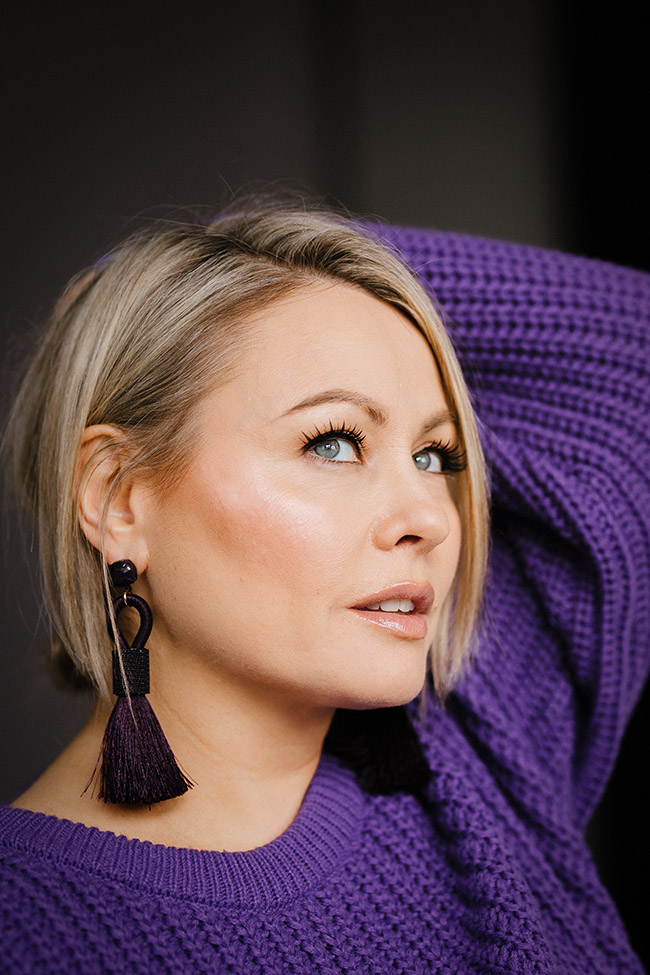 Pour le look de Mitsou , nous avons choisi l’option numéro 4 soit celle de pimenter son jeans Dynamite en l’agençant à un chandail ultra-violet et à des boucles d’oreilles XXL pourpres, tous les deux de chez H&M. Nous avons complété le look avec des escarpins roses Aldo.