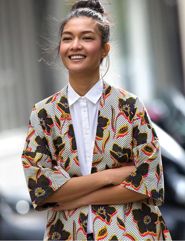 Nous avons osé mixer les deux tendances pour Mitsou. Elle porte ici un chemisier à fleurs de chez H&M et des boucles d’oreilles orangées qui rehaussent parfaitement sa tenue.