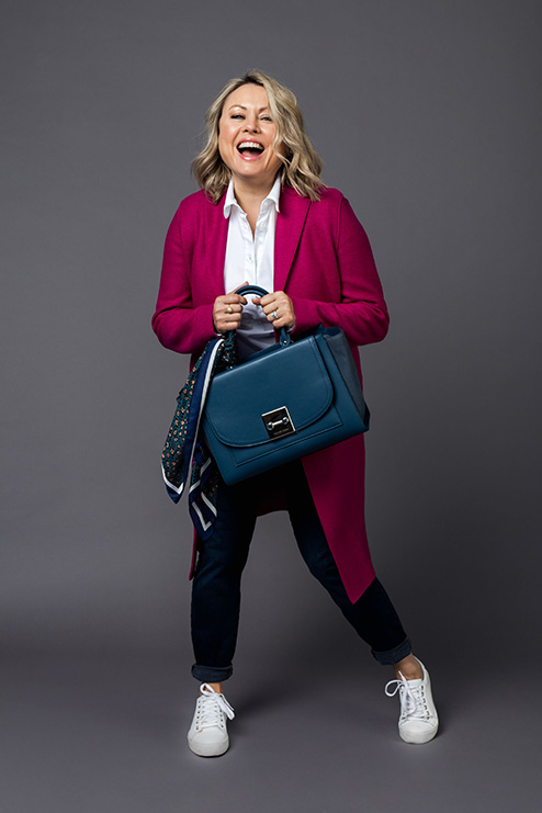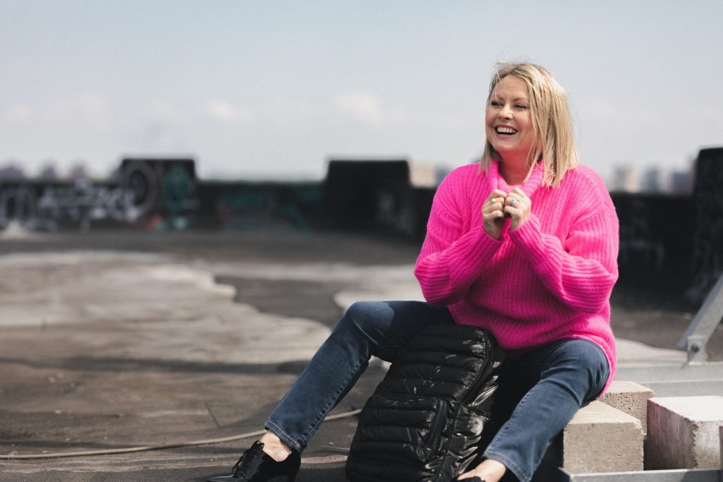 Légende : Mitsou porte un chandail rose néon de chez La Baie avec un jeans. Pas besoin de se casser la tête lors qu’on choisit une pièce colorée! Il suffit de l’agencer avec des couleurs neutres.