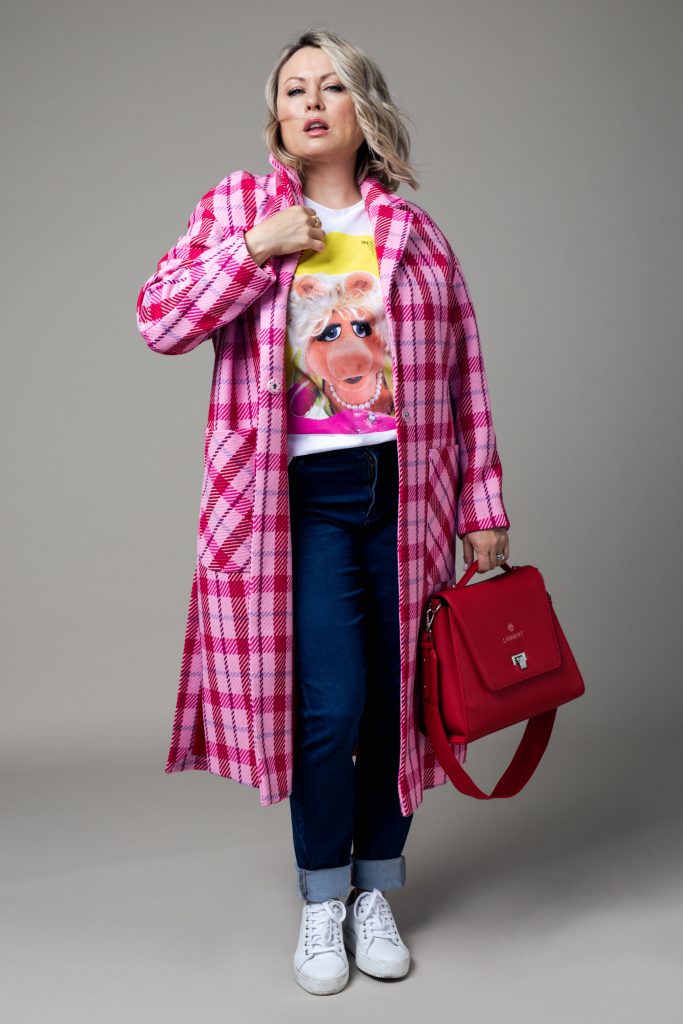 Légende : Ce manteau TOPSHOP à carreaux ne passe certainement pas inaperçu. Il donne de la couleur à la grisaille de l’automne. Avec un t-shirt amusant comme celui-ci à l’effigie de Miss Piggy et des espadrilles, c’est le look week-end parfait. - Le rose peut aussi se porter par simples touches. Si vous avez peur d’oser, choisissez une paire de souliers ou un sac à main teinté de rose.