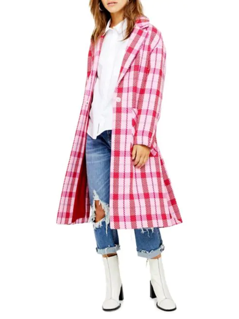 Légende : Mitsou a choisi un manteau mi-long fuchsia de chez La Baie. Avec un jeans, un chemisier blanc classique et des espadrilles blanches, ce look est coloré et confortable. - Les carreaux reviennent saison après saison. Pensez par exemple au classique carreauté rose pâle de Chanel. Que ce soit avec un manteau, une robe, un chemisier ou un pantalon, osez les motifs avec du rose.
