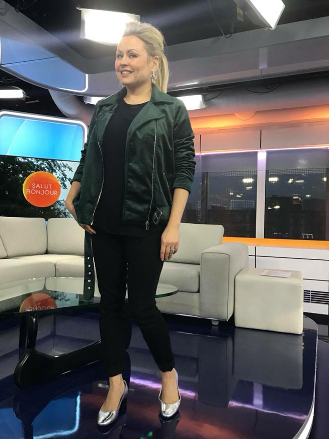Mitsou porte un chandail à motifs noir et argent avec un chemisier à rayures gris et blanc.