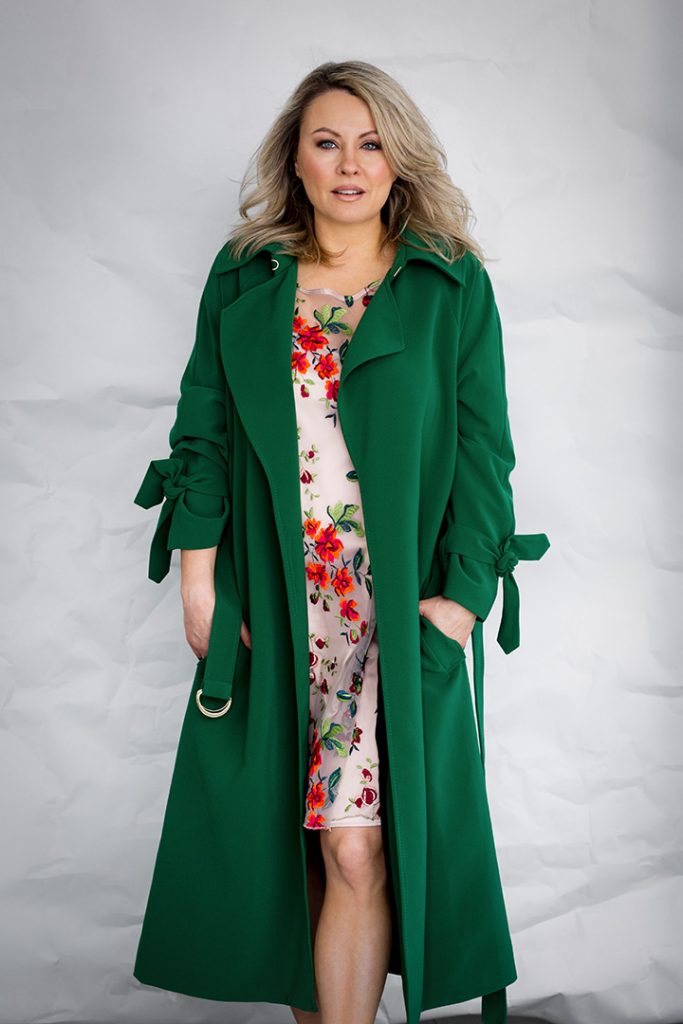 Mitsou porte une robe à broderies florales de chez RW&CO agencée à un trench vert éclatant de chez H&M. Un look idéal pour un souper ou une soirée mondaine.