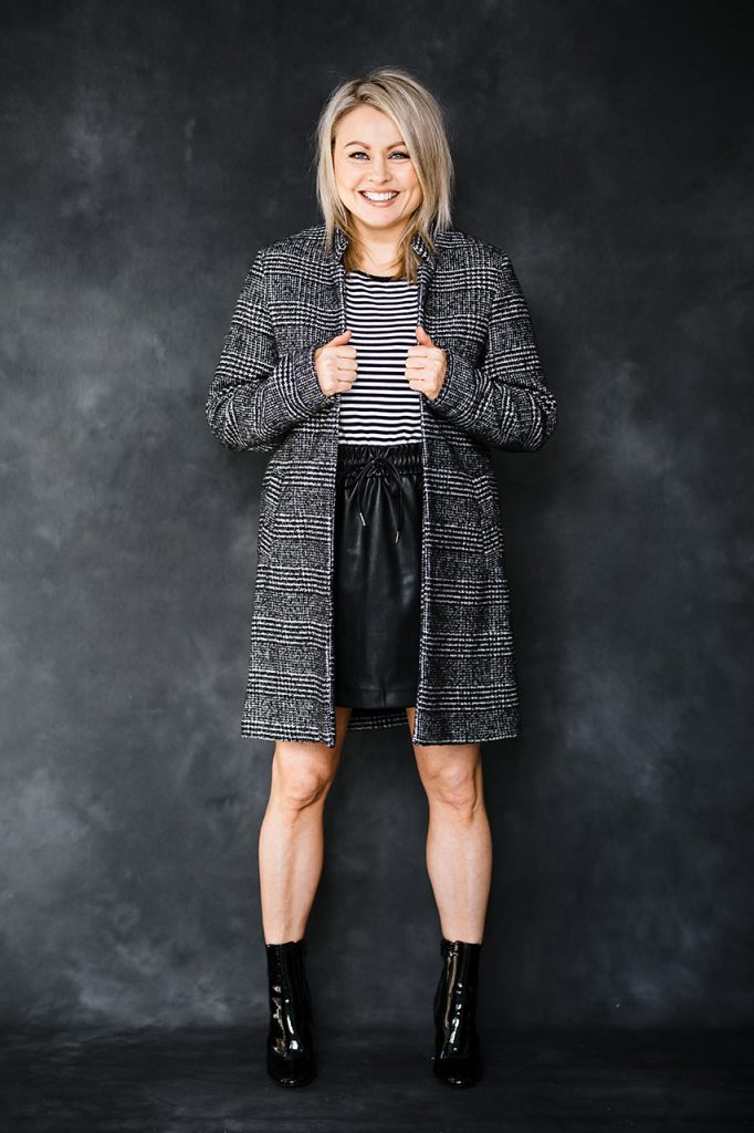 Mitsou porte une jupe en similicuir Dynamite, un chandail à rayures classiques H&M, un manteau à carreaux noir et blanc H&M (en boutique seulement) et des bottes en cuir vernis Aldo. Nous nous sommes amusées à mélanger les rayures et les carreaux et le résultat est magnifique. Il est beaucoup plus facile de mélanger les motifs quand ils sont de mêmes teintes.