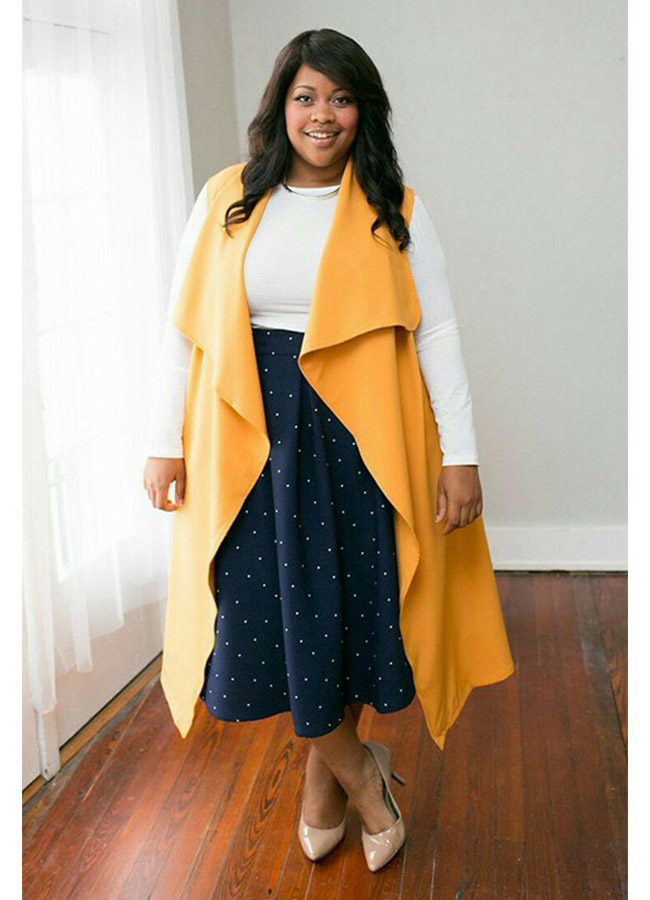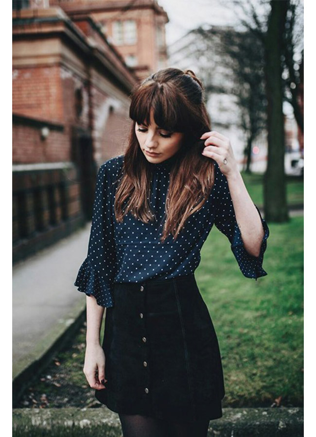 Mitsou porte un chemisier à pois ample de la marque TopShop, une jupe en velours noir unie de chez H&M et une veste sans manches DEX pour donner de la structure et encore plus de style à sa tenue.