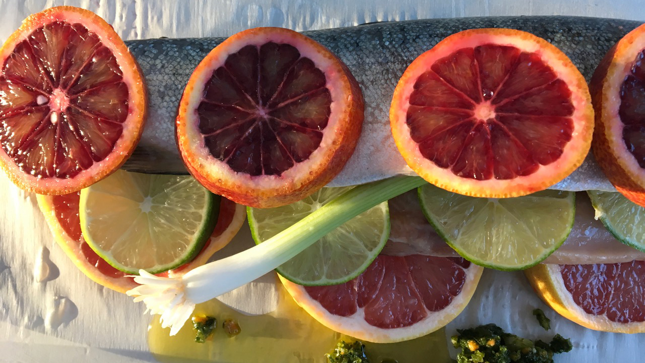 Tranchez votre poisson sur la longueur, à la moitié de sa profondeur. Déposez-le sur les tranches de pamplemousse. Insérez les tranches de lime et l’oignon vert à l’intérieur puis placez les tranches d’oranges sanguines sur le poisson. Mélangez les herbes salées, le sirop d’érable et l’huile d’olive et versez la préparation à l’intérieur du poisson. Emballez le bien dans un sac à cuisson en papier parchemin et enfournez à 400 degrés pendant environ 30 minutes, jusqu’à ce que sa chair soit à votre goût. Vous pouvez ajouter un légume de saison dans le sac. Lorsque vous êtes prêts à déguster votre poisson, écrasez les agrumes pour le parfumer davantage.