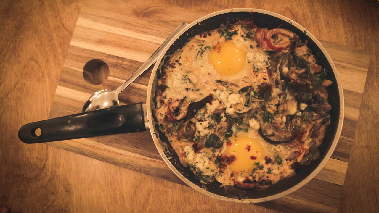 - Ajouter les oeufs et cuire jusqu’à ce que le blanc des oeufs soit cuit, mais que le jaune soit encore coulant.
