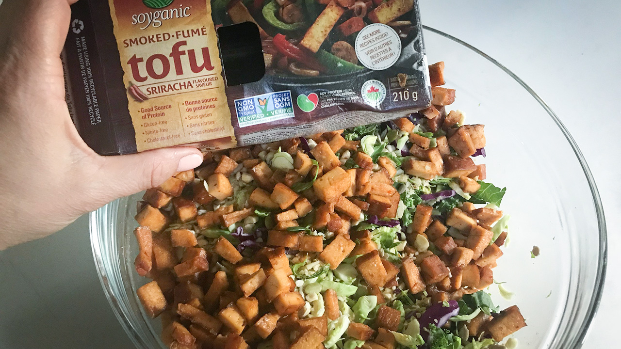 J’ai tout de suite pensé à la recette de salade de choux, de graines et de tofu de ma gardienne Ever dont toute la famille raffole. Ma sœur Abeille lui a apporté un petit kick en nous faisant découvrir le tofu fumé mariné au sriracha (une sauce thaïlandaise piquante). Frit dans la poêle, il a un goût de bacon, je vous le jure!