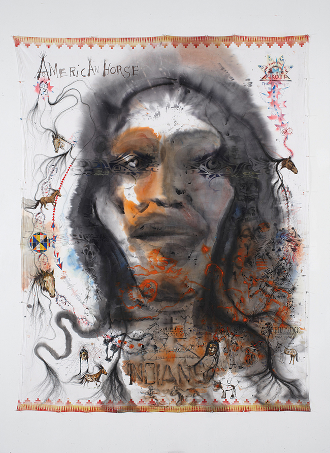 Pas mal de tout puisqu’il s’agit d’une exposition pluridisciplinaire. Peintures, dessins (Marie-Dailey est d’ailleurs très fière de la collection de dessins autochtones originaux), scènes, costumes et accessoires nous plongent dans les mythes et stéréotypes associés au genre western du 19e siècle à aujourd’hui.