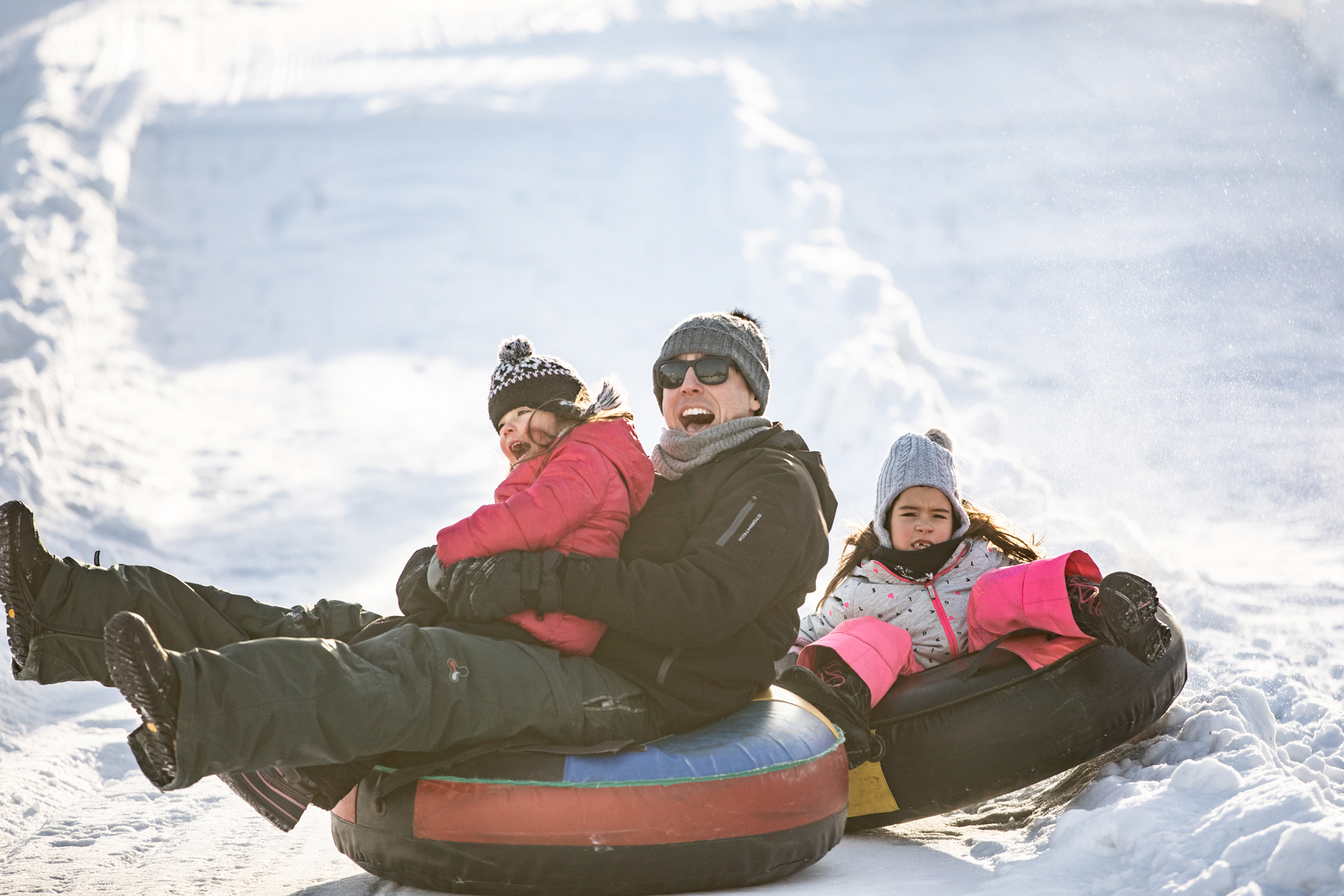 Une fois le tir à l’arc terminé, on a embarqué dans le carrousel (un vrai de vrai) avant de se diriger vers les 4 glissades pour tube. La côte n’est pas très haute, mais pour faire quelques descentes, c’est parfait!