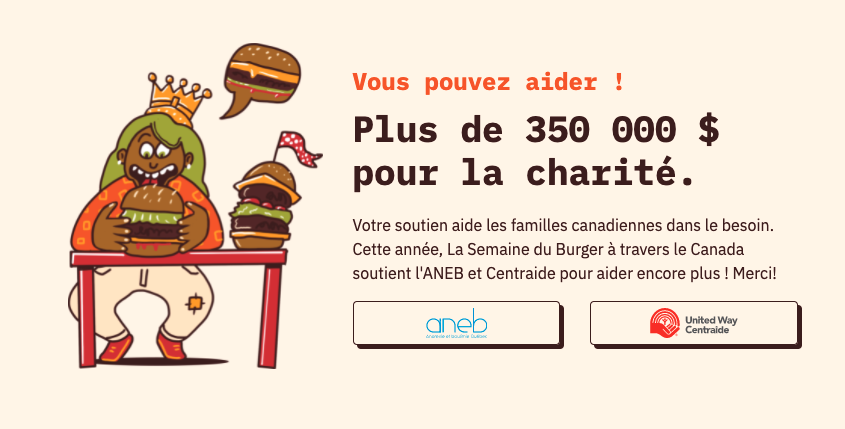 La Semaine du Burger appuie Anorexie et boulimie Québec (ANEB), un organisme québécois qui vise à combattre les troubles du comportement alimentaire et les préjugés qui les entourent et Centraide Canada, un organisme sans but lucratif national qui recueille des fonds et investit pour améliorer la vie des collectivités locales. Durant La Semaine du Burger, les profits des ventes de chaque burger dans les restaurants participants seront remis directement à ces organismes.