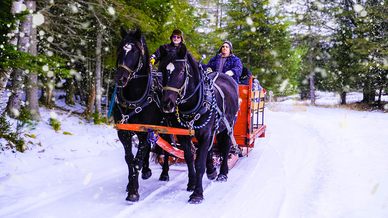 Sophie et Jérôme ont débuté leur aventure par une randonnée en traineau tiré par des chevaux, dans les sentiers de la terre des pionniers. À la fois relaxant et amusant. Ils ont gardé les yeux bien ouverts à la recherche d’animaux tout en écoutant paisiblement les bruits de la nature et les pas des chevaux dans la neige.