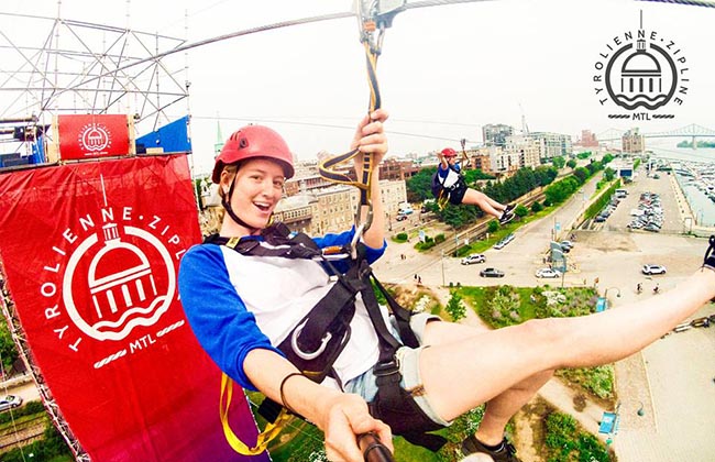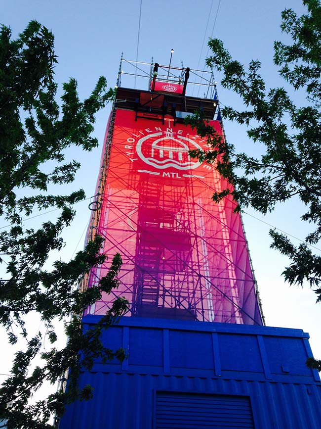 Direction Quick Jump et Tyrolienne, les 2 étant situées au même endroit. Après avoir escaladé plusieurs marches, me voici sur une passerelle située presque au sommet de la tour de 24 m. De cette hauteur, j’admirais calmement la tente du cirque Volta, le fleuve Saint-Laurent, l’île Notre-Dame, l’île Ste-Hélène, quand tout à coup, 3-2-1-0, la passerelle s’est rétractée et je suis tombé dans le vide, bien attaché et poussant un cri à faire fuir tous les oiseaux des environs. Le Quick Jump, c’est complètement fou! Question de vivre encore plus de sensations fortes, je suis retourné dans la tour, mais cette fois-ci au sommet (28 m) afin d’essayer la Tyrolienne de 365 mètres, celle qui m’a fait voler jusqu’au bord du Saint-Laurent. Deux expériences à couper le souffle!