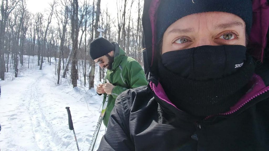 Je me suis réveillée avec plein de nouveaux muscles (re-ouch) et une idée précise : faire la Piste B, suivie de la A et terminer la boucle par la fameuse C, mais dans le sens opposé qu’hier… donc en descente! Yihou! On m’a avisée que la B était ouverte, mais extrêmement difficile. J’étais décidée. Armés de nos peaux de phoque sous les skis, de collations et de ma tête de cochon, on est partis!