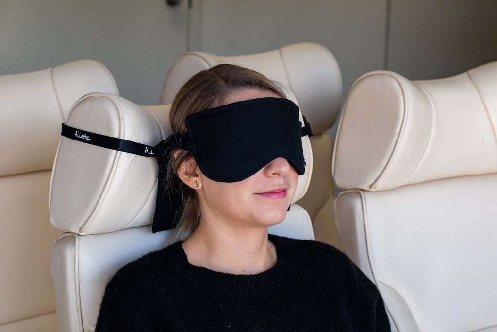 J’ai récemment lu un article sur le All Asleep, une création québécoise qui a piqué ma curiosité et que j’ai eu envie d’essayer. Il s’agit d’un masque pour le yeux pour l’avion qui s’accroche à l’appuie-tête du siège pour tenir la tête quand on dort. Fini la tête qui tombe et le mal de cou qui vient avec!