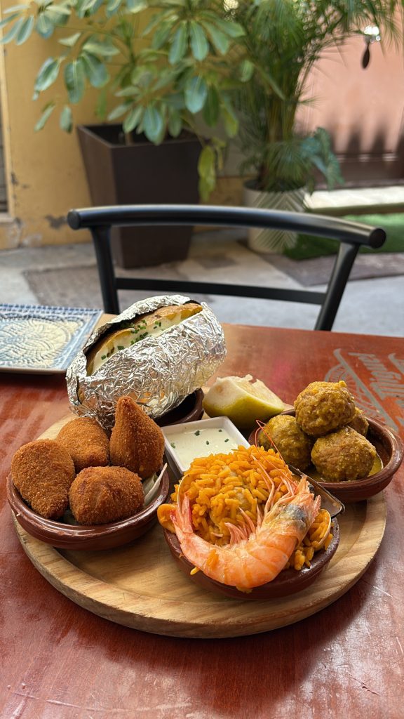 Je salive encore. C’est là qu’on a goûté à nos premiers tapas en Espagne! Le Picasso Bar Tapas est coloré et immense. Notre table était située dans une ruelle fleurie, fort jolie. On a partagé cinq plats, un comprenant des fruits de mer, leurs fameuses patatas alioli (patates avec une sauce à l’ail), des croquettes de jambon, une paella et des petites boulettes de bœuf.