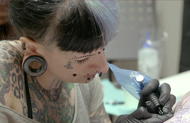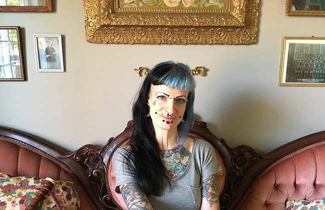 Marginale dès l’adolescence, Karine redéfinit les normes de beauté avec une seule règle: être unique. Cette artiste tatoueuse au passé de squeegee est la fondatrice de Kitch Tatouage. Elle a fait de la création son mode de vie, et de son corps, une toile. Elle est tatouée de la tête aux pieds et arbore plusieurs piercings. Je vous avoue que je suis tombée sous le charme de cette fille dès la première seconde de notre rencontre. Karine a une âme artistique très développée et elle ne crée pas des dessins sur demande. Elle s’inspire des envies des gens pour développer des designs totalement éclatés. Vous lui demandez de vous tatouer un sous-marin (pour aller sous l’eau) et elle risque de vous dessiner un sous-marin avec jambon et fromage! Son chum est aussi cool qu’elle. On peut dire qu’il l’a dans la peau puisque ses oeuvres couvrent son corps. Ses tatouages sont une ode aux humoristes québécois d’une autre époque: Gilles Latulipe, Monsieur Tranquille et j’en passe! Je me suis retrouvée à genoux devant lui, mais pas pour les raisons que vous pourriez imaginer!